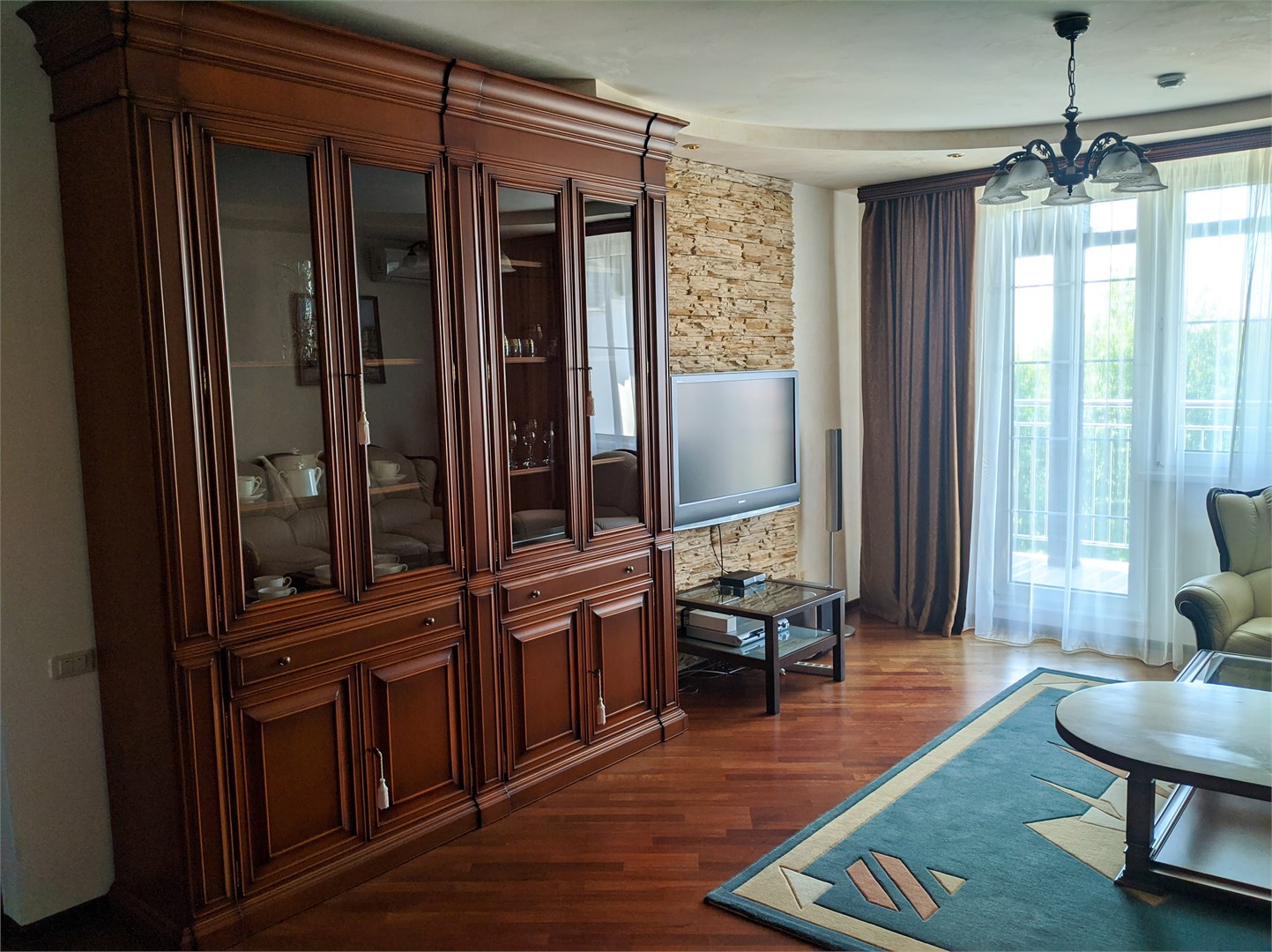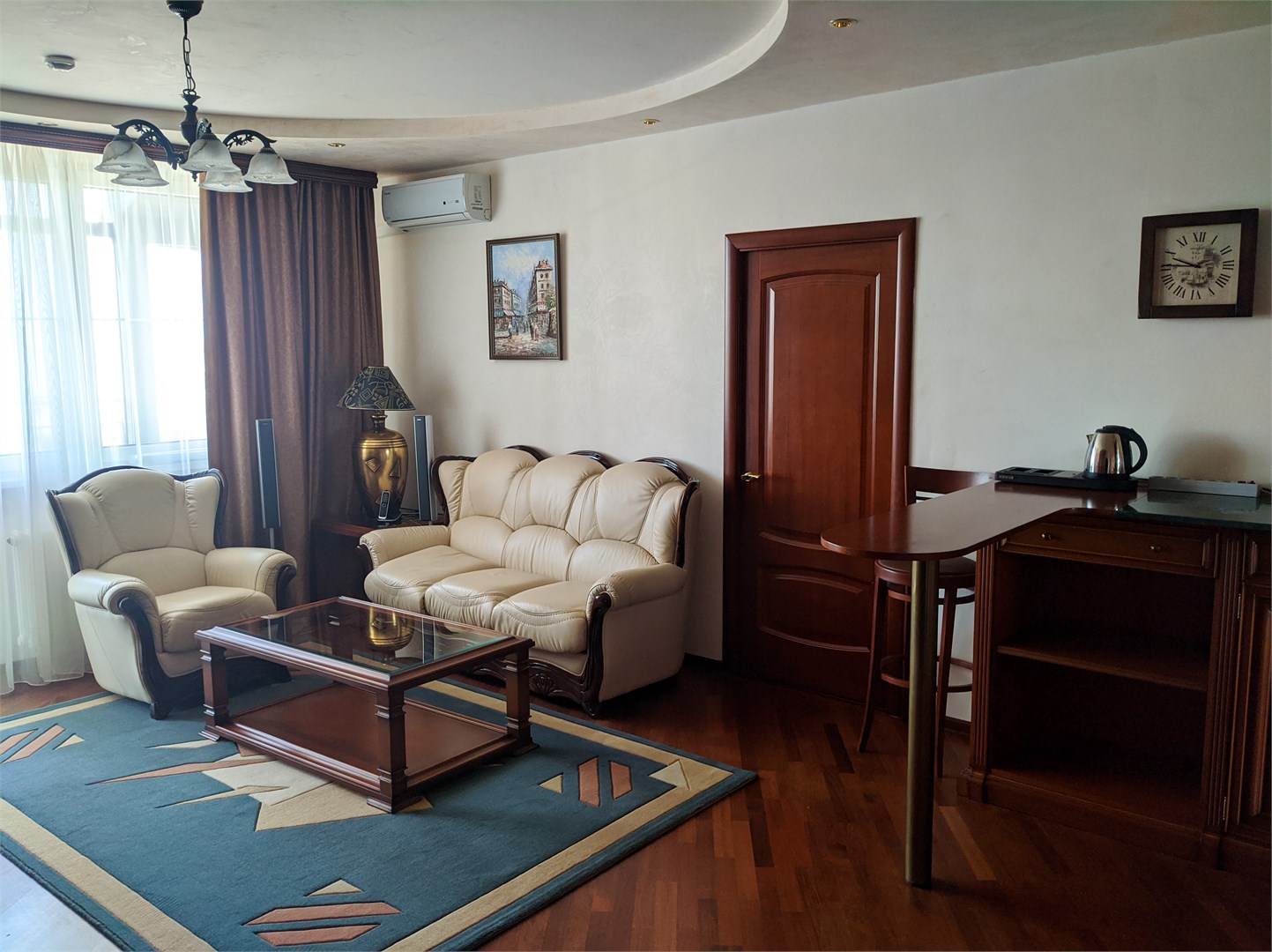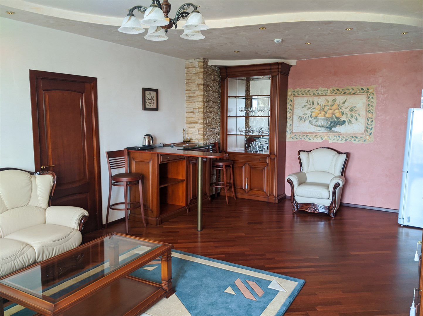 - Мебель: вешалка, диван, зеркало, кресла, кровать двуспальная, прикроватные тумбочки, стол, стулья, шкаф