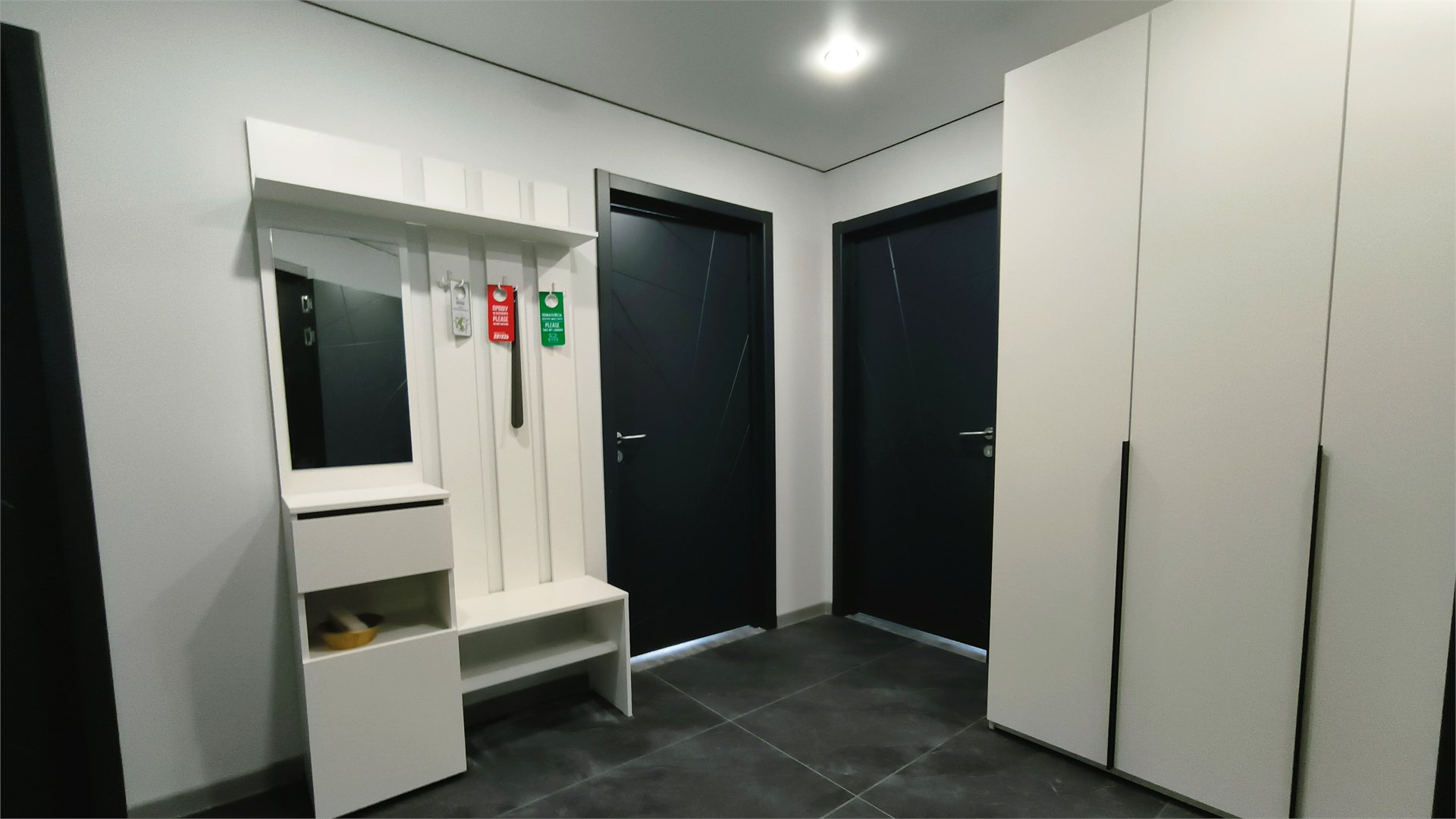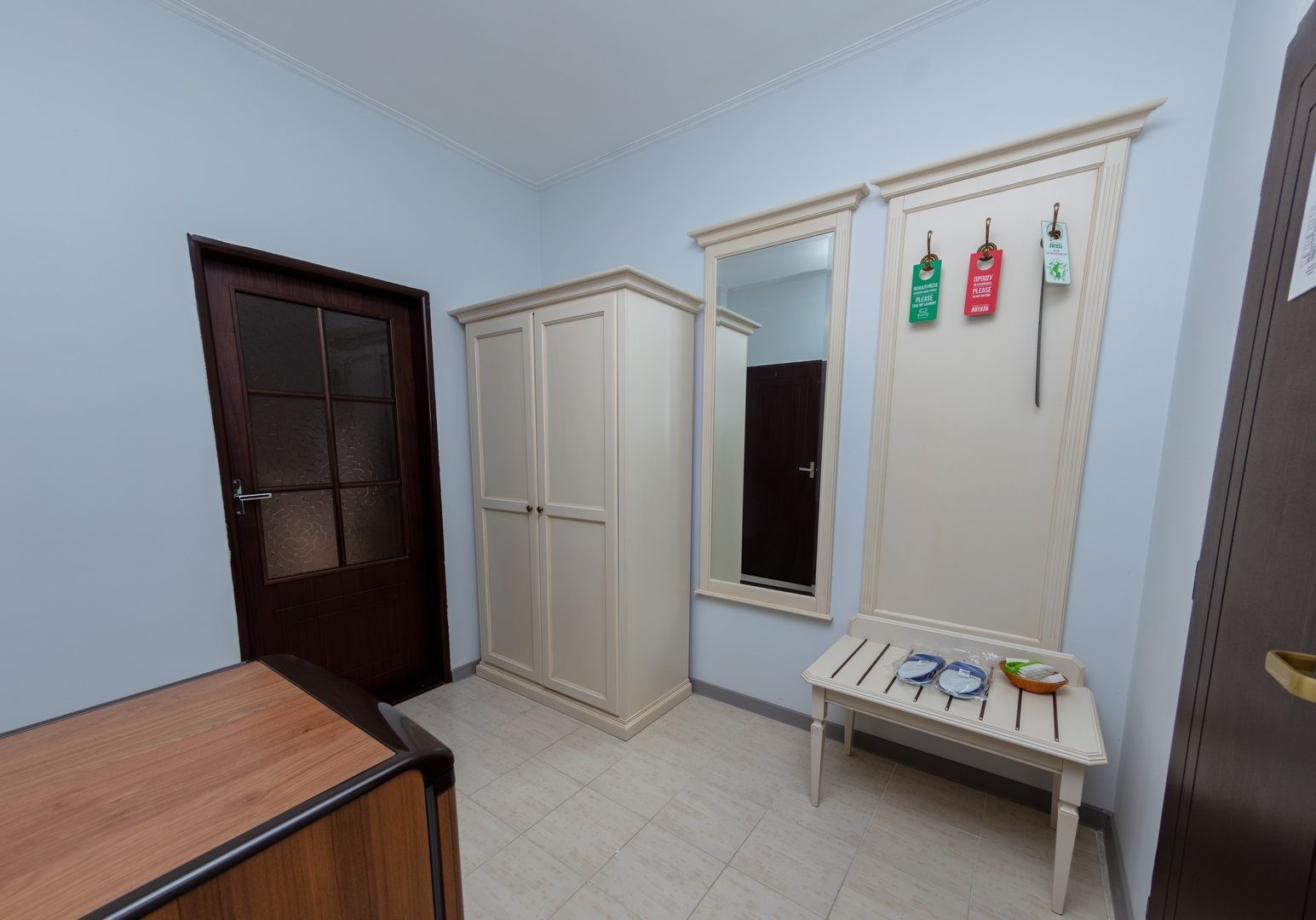 - Мебель: вешалка, зеркало, кровати односпальные /одна двуспальная кровать, прикроватные тумбочки, стол, стулья, шкаф